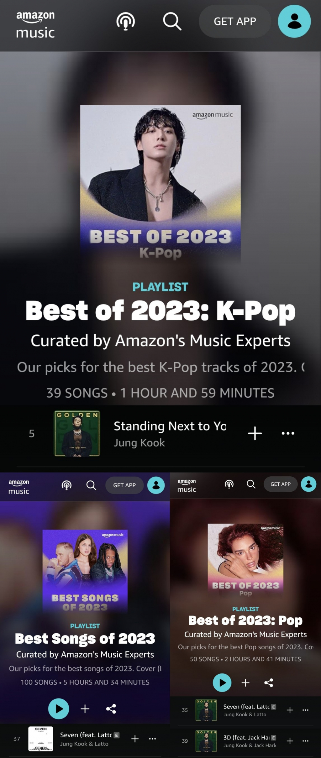 정국의 솔로 싱글 'Seven', '3D' 협업곡 'TOO MUCH'는 아마존 뮤직의 '2023 베스트 오브 팝'(Best of 2023: Pop) 플레이리스트에도 올랐다.
