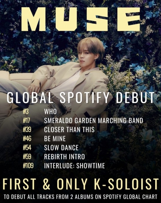 이번 지민의 앨범 '뮤즈'는 스포티파이 19일 기준 전체 2,274만 6,705(filtered/unfiltered 2,625만 8,501)스트리밍으로 데뷔해 단 7곡 만으로 2024년 K팝의 아티스트 앨범 최다 스트리밍 기록을 세우는 등 타이틀 뿐만 아니라 수록곡 역시 많은 사랑을 받고 있다.
