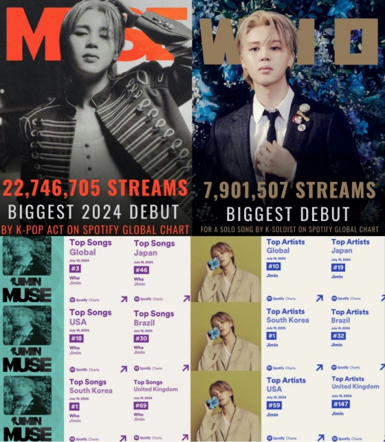 19일 오후 1시 발매된 지민의 솔로 2집 '뮤즈(MUSE)' 타이틀곡 '후(Who)'는 공개 첫 날 790만 1,507(filtered/unfiltered 999만 983) 스트리밍을 기록, 이는 역대 K팝 솔로곡 최다 스트리밍 신기록이다.