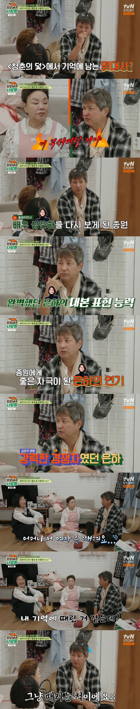 김수미는 "심은하 뺨 엄청 때렸지?"라고 물었다. 이에 이종원은 당황하며 "저 여자 못 때린다. 그냥 때리는 척만 했을 거다. 박상아 씨와 찍었던 강제 키스신이 있었다. 그걸 열댓 번을 찍었다. 박상아 씨가 나중에는 미안해서 울더라"라고 회상했다.