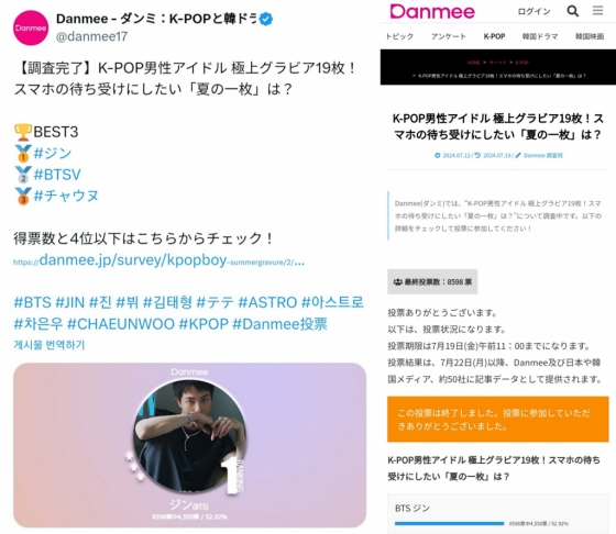 일본에서 뜨거운 사랑을 받는 진은 앞서 단미에서 진행한 '가창력을 넘는 미성의 소유자! K-POP을 대표하는 30대 가신님', '마치 방부제 미모! 최강동안 얼굴의 30대 K-POP 남자 아이돌', '두 번째 단추를 받고 싶은 K팝의 동경하는 선배', 'K팝 남성 아이돌 최강의 졸업앨범', '매혹적이고 만지고 싶은 입술을 가진 K팝 남자 아이돌', '2024년 제대가 즐거운 한국 연예인', '맛있는 손수 만든 요리를 대접해 줄 것 같은 K팝 남자 아이돌', '군복이 가장 잘 어울린다고 생각하는 K-POP 남성 아이돌', '물에 젖어도 멋있는 남자! 6월의 캘린더로 하고 싶은 K-POP 남성 아이돌', '순수한 마음에 심쿵! K-POP 계의 '어린 왕자' 등 설문에서 1위를 휩쓸며 최강의 인기를 실감케 했다.