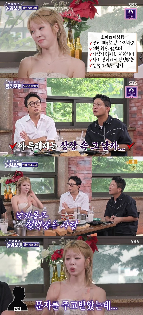 초아의 이상형은 '눈이 매섭지만 다정', '예민하진 않은', '자산이 많아도 똑똑', '자기 분야에서 인정받는 열정 가득'한 사람이라는 것. 이에 초아는 "한참 눈 찢어지고 예민미 있는 사람이 멋있어 보였다. 얼굴 봤을 때 뭔가 날카롭고 철벽같은 남자"라고 설명했다.