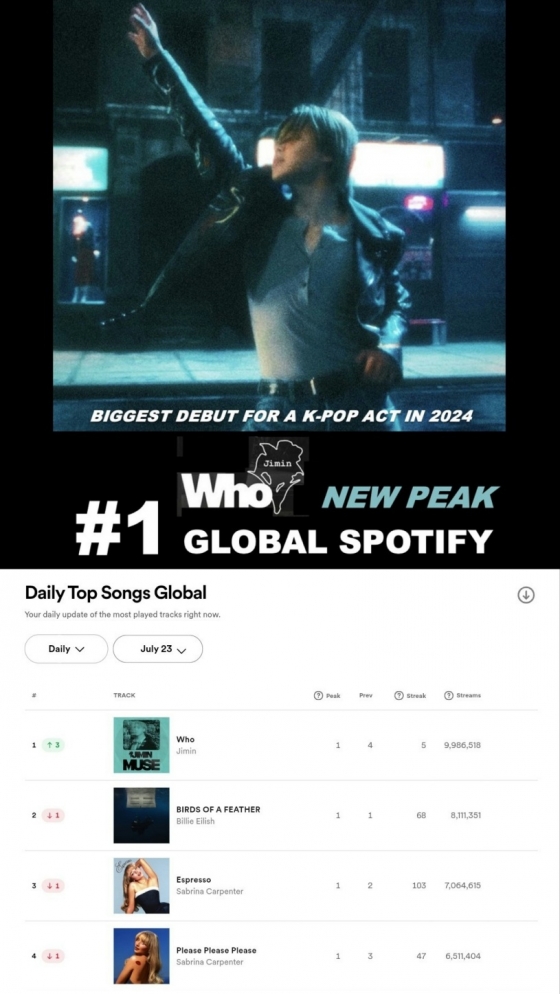 방탄소년단(BTS) 지민의 솔로 2집 타이틀곡 '후(Who)'가 세계 최대 음원 플랫폼 스포티파이 '글로벌 일간 톱 송' 차트 1위에 오르며 인기를 빛냈다.