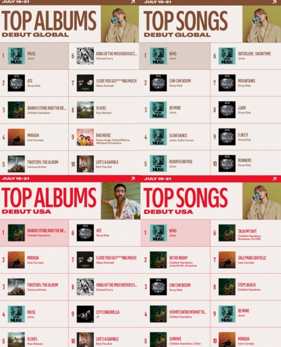 지난 19일 발매한 지민의 솔로 앨범 2집 '뮤즈'는 스포티파이 '글로벌 톱 앨범 데뷔'(7월19일~7월21일) 차트 1위에 올랐으며 '미국 톱 앨범 데뷔' 차트에서는 4위를 기록, 가장 높은 K팝 앨범 순위를 차지했다.