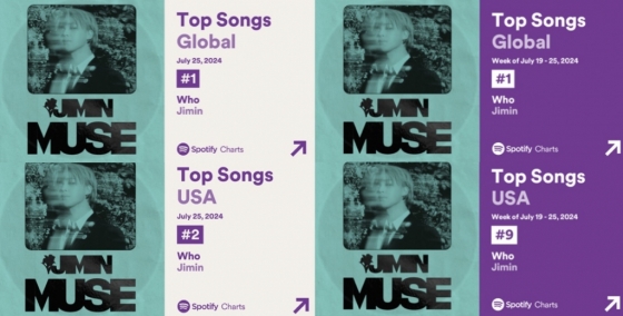 한편 지민의 '뮤즈'(MUSE)는 스포티파이 '글로벌 주간 톱 앨범'(7월19일 - 25일) 차트 3위에 올라 단 7곡만으로 발매 첫 주 1억 1389만 1826 스트리밍의 놀라운 기록으로 데뷔해 올해 최고 앨범 데뷔 기록을 경신, 지민은 스포티파이에서 앨범과 송 차트 모두에서 최정상을 휩쓸며 군백기에도 막강 인기를 과시하고 있다.