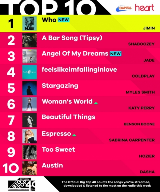 26일(현지시간) 발표된 영국 오피셜 차트에 따르면, 지민의 솔로 2집 타이틀곡 '후'(Who)는 오피셜 싱글 차트 '톱 100'에서 4위에 올라 자체 최고 순위에 진입했다.