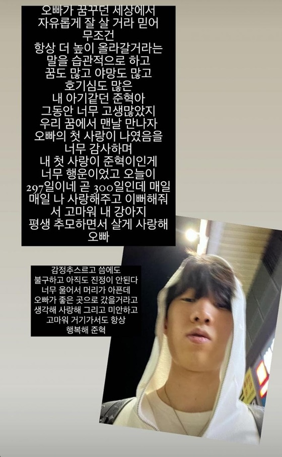 이어 그는 "오늘이 297일이네. 곧 300일인데 매일 매일 나 사랑해주고 예뻐해줘서 고마워 내 강아지. 평생 추모하면서 살게. 사랑해 오빠. 감정 추스르고 씀에도 불구하고 아직도 진정이 안 된다. 너무 울어서 머리가 아픈데 오빠가 좋은 곳으로 갔을 거라고 생각해. 사랑해. 그리고 미안하고 고마워. 거기가서도 항상 행복해 준혁"이라며 치트키를 추모했다.