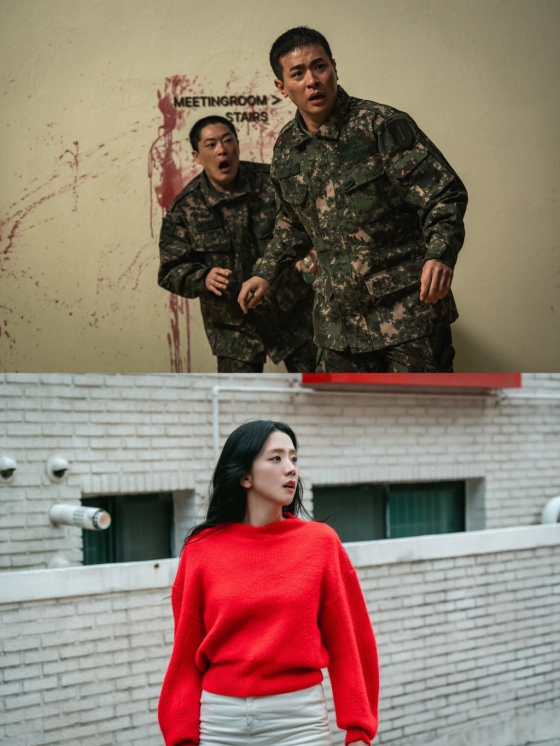 공개된 스틸에서 군 복무 중 좀비 사태와 맞닥뜨리는 재윤(박정민)은 숨 가쁜 모습과 경악하는 표정으로 이목을 집중시킨다. 그의 곁에서 유쾌한 케미를 보여줄 후임 인호(임성재)는 한층 더 놀란 모습을 보이며 위태로운 상황을 고스란히 전한다. 반면, 영주(지수)는 다소 평온해 보이는 골목길에서 시선을 빼앗겨 스토리에 대한 호기심을 한층 더 증폭시킨다.