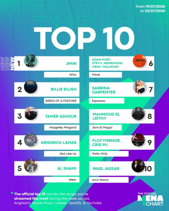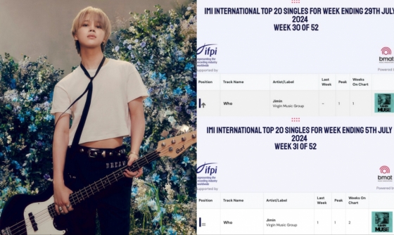 지민은 7월 19일 발매한 솔로 2집 '뮤즈(MUSE)' 타이틀곡 '후(WHO)'로 미국 빌보드를 비롯한 글로벌 차트에서 돌풍을 이어가고 있는 가운데 중동·북아프리카 오피셜 차트인 MENA(Middle East and North Africa)에서 영예의 1위를 차지했다.