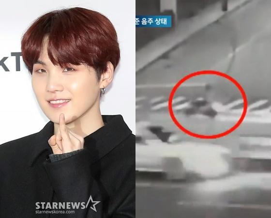 7일 오후 JTBC '뉴스룸'은 슈가의 사고 현장 CCTV를 보도했다. 사회복무요원으로 복무 중인 슈가는 6일 밤 11시께 서울 용산구 한남동 길가에서 전동 스쿠터를 타다 혼자 넘어진 채 발견됐다. 마침 인근을 순찰하던 경찰이 도움을 주었으나, 그에게서 술 냄새가 확인되며 지구대로 넘겨졌다. 결국 슈가는 음주 측정을 받았으며 그 결과 혈중알코올농도가 면허 취소 수준(0.08%)으로 나타났다.