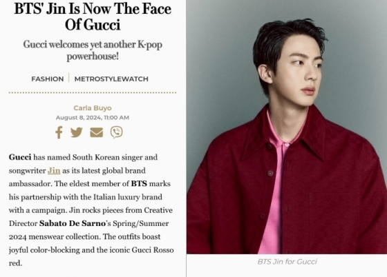 해외 매체 'METRO.STYLE'은 '방탄소년단 진은 이제 구찌의 얼굴이다'라는 기사를 통해 대표 글로벌 슈퍼스타 진이 '구찌의 얼굴'임을 공표했다.