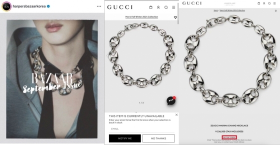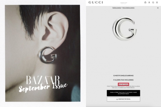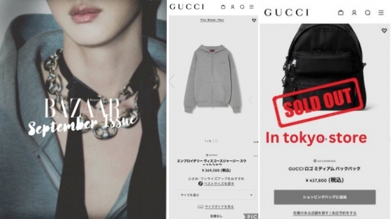 진은 구찌의 글로벌 앰버서더가 된 후에도 마찬가지로 공식 홈페이지 다운과 초고속 품절 행진을 이어가며 전 세계적에서 독보적인 인기와 파워를 증명했다.