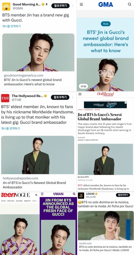 전 세계 언론은 글로벌 톱 인기 그룹 방탄소년단의 비주얼 센터 진이 구찌의 새 얼굴이 된 소식을 발빠르게 전했다. 진이 구찌의 글로벌 앰버서더가 된 소식을 처음 전한 미국 패션 산업지 'WWD'(Women's Wear Daily) 외에도 미국 ABC 방송국의 '굿모닝 아메리카', '더 할리우드 리포터', '틴보그', 'V 매거진', 스페인어권 최대 음악 채널 'LOS40' 등 전 세계 주요 매체가 구찌 글로벌 앰버서더 진을 집중조명했다.