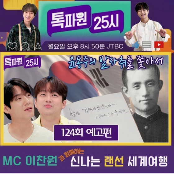 윤동주의 시비를 본 이찬원은 "꼭 기억하겠습니다"라며 나지막한 목소리로 말해 큰 울림을 주었다. 12일 오후 8시 50분 방송된다.