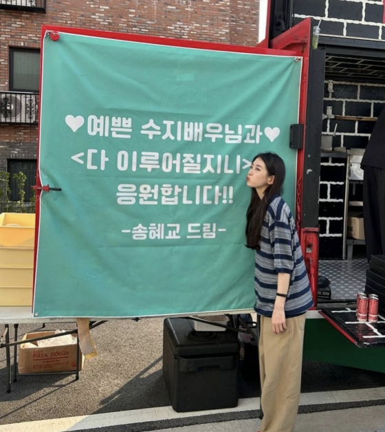 공개된 사진에는 송혜교가 수지를 위해 준비한 촬영장 간식차가 담겼다. 특히 송혜교는 '예쁜 수지 배우와 '다 이루어질지니' 응원합니다'라는 문구를 더하며 우정을 자랑했다.