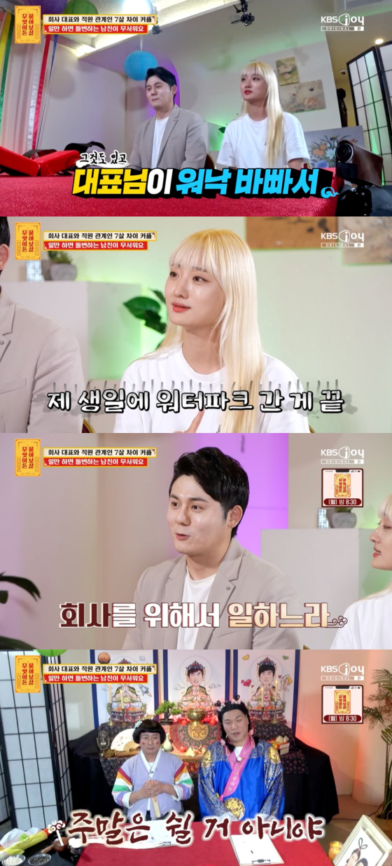 이날 7세 연하 팀장 여자친구는 "데이트를 1년에 한 번밖에 못 한다. 1년에 한 번 하는 데이트도 내 생일 때"라고 대표인 남자친구에 대한 서운함을 토로했다.