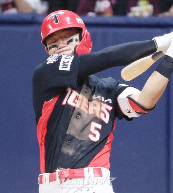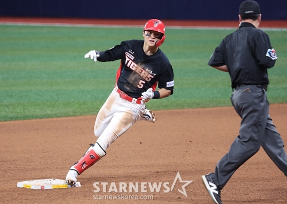 경기 전반 가장 임팩트 있는 장면이 김도영의 5회 초 타석이었다. 김도영은 후라도의 초구 시속 145km 직구를 통타해 우측 담장을 맞히는 대형 타구를 만들었다. 우익수 임병욱이 펜스에 부딪혀 잡지 못하는 상황에서 김도영은 3루까지 내달렸다. 3루에 도달한 시점이 막 내야수에게 공이 전달된 상황이었다. 김도영의 주력을 생각한다면 그라운드 홈런도 노려볼 만 했으나, 홈을 노리진 않았다.