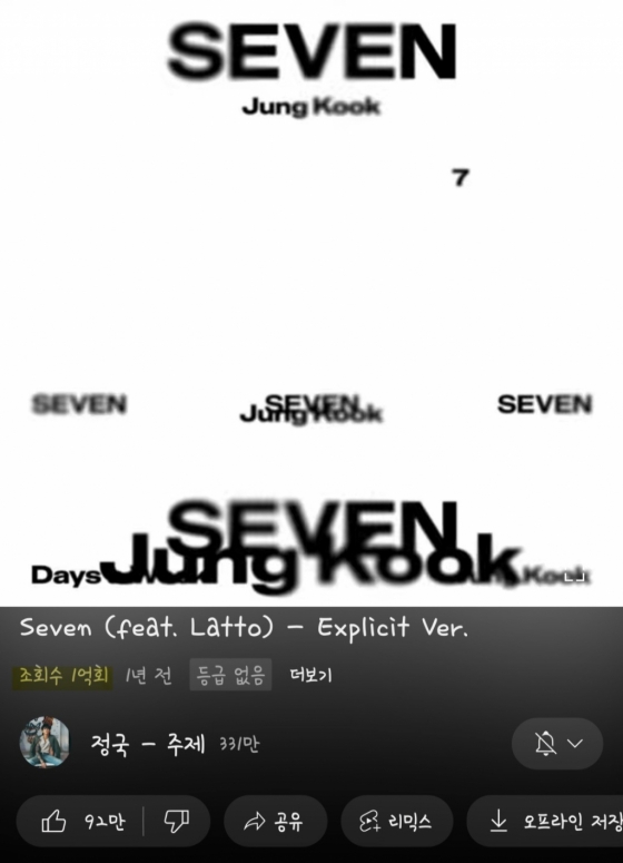정국의 유튜브 공식 토픽(Topic:주제)에 올라있는 솔로 싱글 'Seven' 익스플리시트 버전(Explicit Ver.) 오디오 영상은 최근 조회수 1억을 넘어섰다.