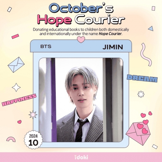 지민은 또 8월 21일부터 29일까지 진행된 '희망 배달부 투표'에서 팬들의 압도적 지지를 받으며 '10월의 희망 배달부'로 선정됐다. 이는 아이도키에서 진행하는 '기부달성형 투표'로, 해당 기간 동안 10만 표 이상 하트를 받은 아티스트의 이름으로 홀트아동복지회를 통해 전 세계 도움이 필요한 어린이들에게 기부를 진행하고 기부확인서도 발행한다.