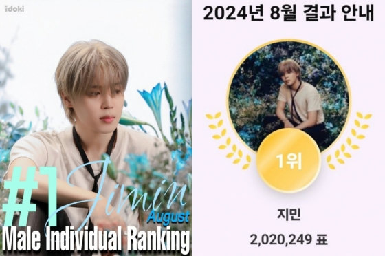 지민은 지난 8월 31일 마감된 K팝 아이돌 투표 앱 아이도키(iDOKI)의 '남자 개인 랭킹 8월 투표'에서 총 202만 249표를 획득해 1위에 올랐다. 이로써 지민은 해당 투표에 첫 참가 이후 5개월 연속 우승을 차지했다.