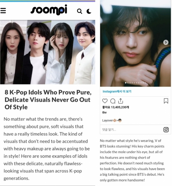 K-컬처를 다루는 영문 웹사이트 숨피(Soompi)는 "순수하고 섬세한 비주얼은 결코 유행을 타지 않는다는 것을 증명한 8인의 K팝 아이돌"이라는 기사에서 뷔의 완벽한 미모를 조명했다.