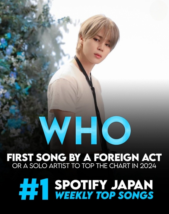 2024년 스포티파이 일본 주간 차트에서 1위를 차지한 가수는 단 4개의 팀에 불과하며, 지민은 7위로 데뷔해 2위를 이어오다 첫 1위에 올라 1위에 오른 4팀 중 유일한 외국 아티스트이자 솔로 아티스트로 이름을 올렸다.