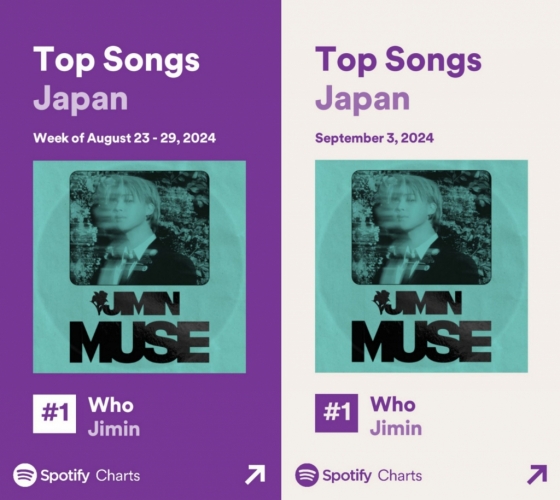 지민의 솔로 2집 'MUSE'(뮤즈) 타이틀곡 '후'는 8월 30일 발표된 스포티파이 일본 '위클리 톱 송'(8월 23일~ 8월 29일) 차트에서 1위에 등극했다.