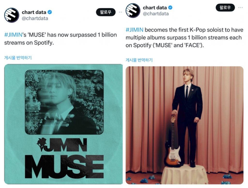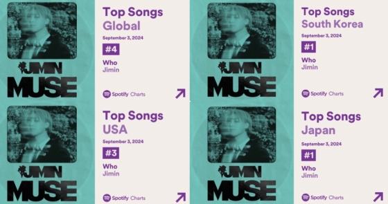 방탄소년단(BTS) 지민의 'MUSE'(뮤즈)가 스포티파이에서 2024년 K팝 앨범 최초로 10억 스트리밍을 달성했다.