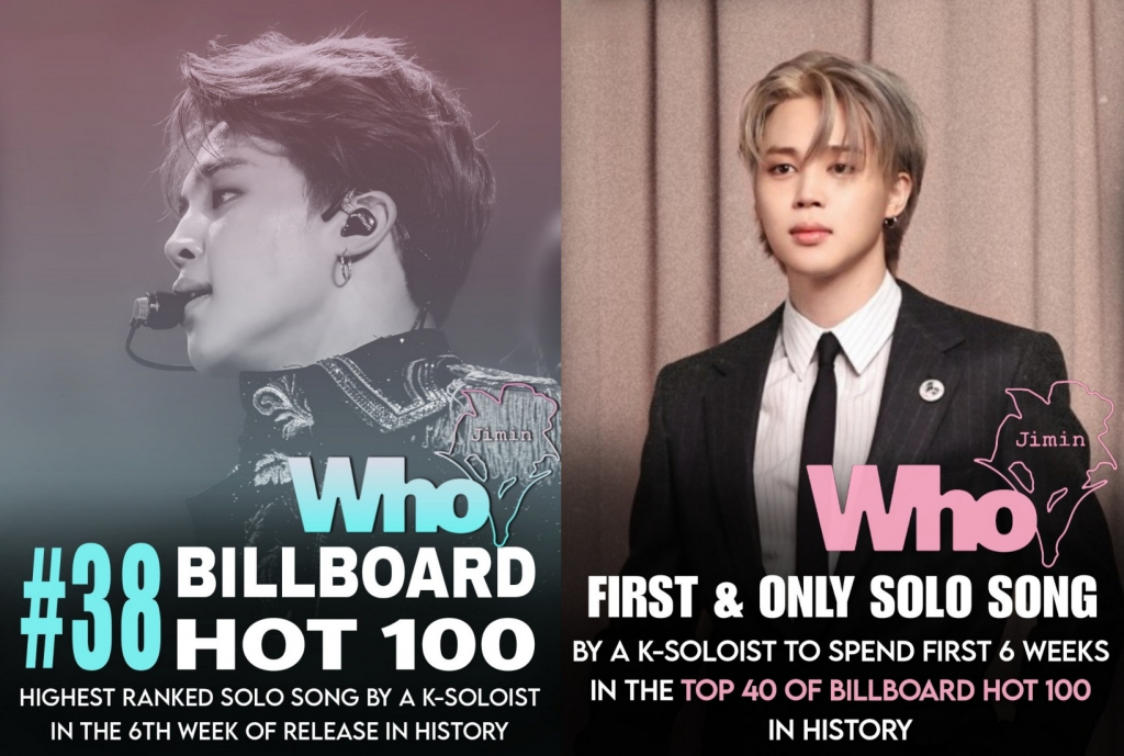 방탄소년단(BTS) 지민이 솔로곡 'Who'(후) 발매 6주차에도 빌보드 차트에서 맹활약하며 K팝 대표 가수로서 '월클' 존재감을 빛냈다.