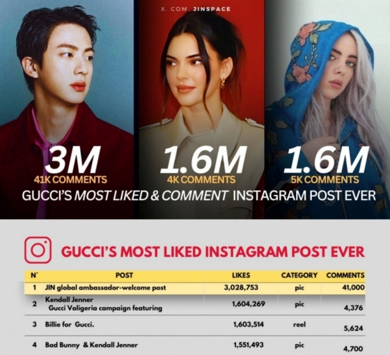 진의 압도적인 영향력으로 글로벌 앰버서더인 진 관련 구찌의 모든 게시물이 구찌 인스타그램 역사상 가장 많은 좋아요를 받은 게시물 1위를 포함, 모두 상위 20위 안에 들었다.