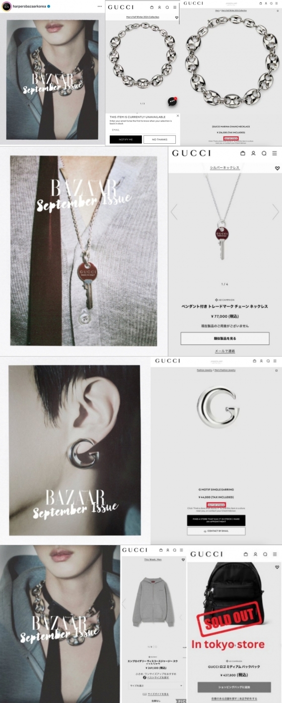 또한 패션 잡지 하퍼스 바자(Harper's BAZAAR)에서 구찌 제품을 착용한 '미의 남신' 진의 화보를 공개하자마자 초고속 글로벌 품절 행진을 일으켰다.