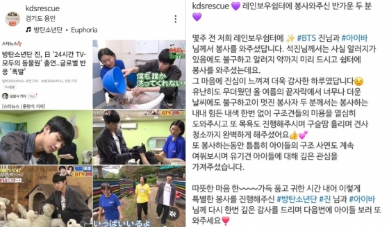 한편 유기견 보호소인 '레인보우 쉼터'는 최근 인스타그램을 통해 진과 아이바가 봉사를 온 소식을 전하며, 진이 알레르기가 있음에도 불구하고 알레르기약까지 미리 먹은 후 봉사를 한 사실을 밝혔다.