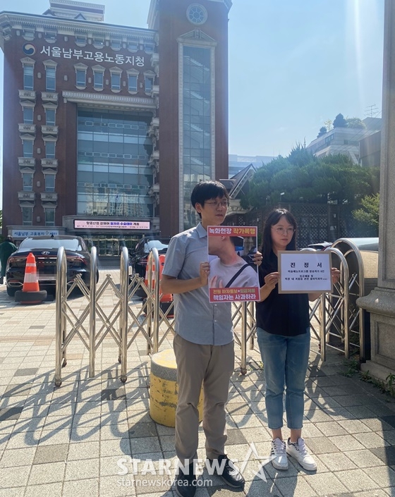 11일 오전 서울 영등포구 고용노동부 서울남부지청 정문 앞에선 미술 예능 프로그램 방송작가 폭행·계약해지·임금체불 고발 기자회견이 진행됐다. 한빛미디어노동인권센터 김영민 센터장, 방송작가 유니온의 박선영 수석부지부장, 권리찾기 유니온 정진우 위원장을 비롯해 방송작가 A, B, C 씨 등이 참석했다.