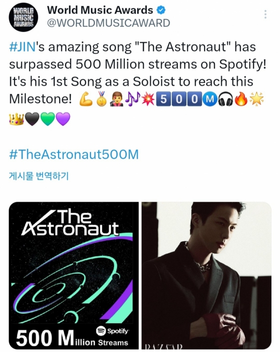 '월드 뮤직 어워드'(World Music Award/WMA)는 공식 계정을 통해 "진의 놀라운 곡 'The Astronaut'이 스포티파이에서 5억 스트리밍을 돌파했습니다. 솔로 가수로서의 진에게는 이 이정표에 도달한 첫 번 째 곡입니다" 라며 축하를 전했다.