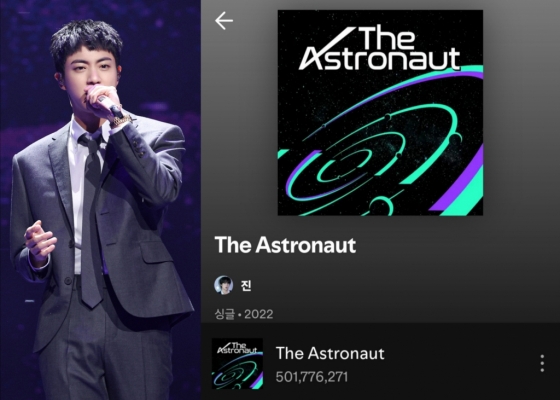 방탄소년단(BTS) 진의 솔로곡 '디 애스트로넛'(The Astronaut)이 스포티파이에서 5억 스트리밍을 돌파하며 막강 음원 파워를 빛냈다.
