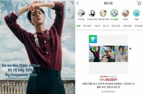 방탄소년단(BTS) 진이 커버인 10월호 보그 코리아 3종 세트가 도서 베스트 셀러 1위를 기록하며 독보적인 인기와 영향력을 빛냈다.
