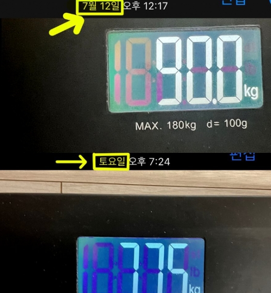 김형준은 이에 더해 7월 12일 90kg였던 몸무게가 지난 7일에는 77.5kg로 감량된 체중계 사진도 공개했다.