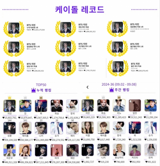 또한 케이돌 레코드 '일일랭킹 최장 1위' 부문에서 1위부터 5위까지 죄다 싹쓸이한 지민은 9월 14일 기준, 총 1125회 1위를 기록해 2위와는 1천 회 가까운 차이로 글로벌 팬들의 압도적 지지를 받고 있음을 보여줬다.