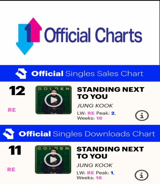 '영국 오피셜'(UK Official) 차트가 공개한 최신 차트(9월 13일~19일 자)에 따르면, 정국의 솔로곡 'Standing Next to You'는 '오피셜 싱글 다운로드 차트' 11위에 재진입했다.