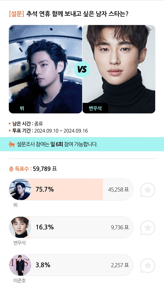 뷔는 지난 10일부터 16일까지 종합 엔터테인먼트 모바일 앱 스타폴(STARPOLL)에서 진행된 '추석 연휴 함께 보내고 싶은 남자 스타는?' 설문에서 1위에 올랐다.