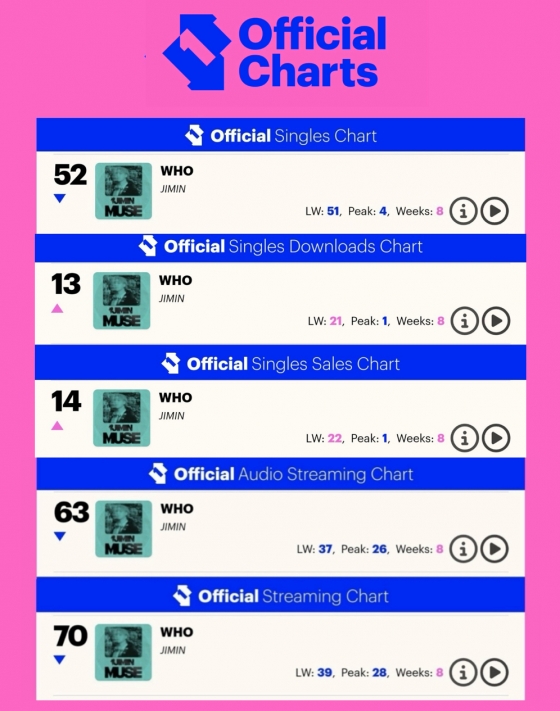 14일(한국 시간) 발표된 영국 오피셜 차트에 따르면 지민의 솔로 2집 'MUSE'(뮤즈) 타이틀 곡 'Who'(후)는 영국 오피셜 싱글 차트 톱100 (Official Singles Top100 Chart)에서 52위에 올라 8주 연속 차트인에 성공했다.