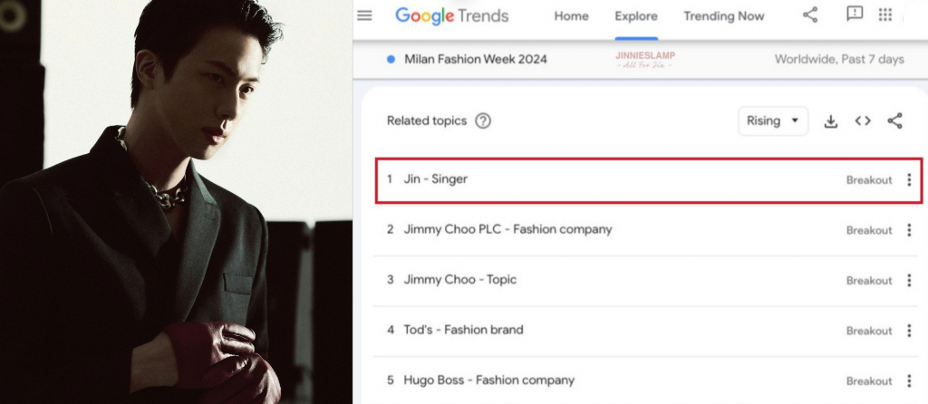 방탄소년단(BTS) 진이 '2024 밀라노 패션 위크'(Milan Fashion Week 2024) 관련 구글 검색어 1위를 차지, 글로벌 패션 아이콘 면모를 빛냈다.