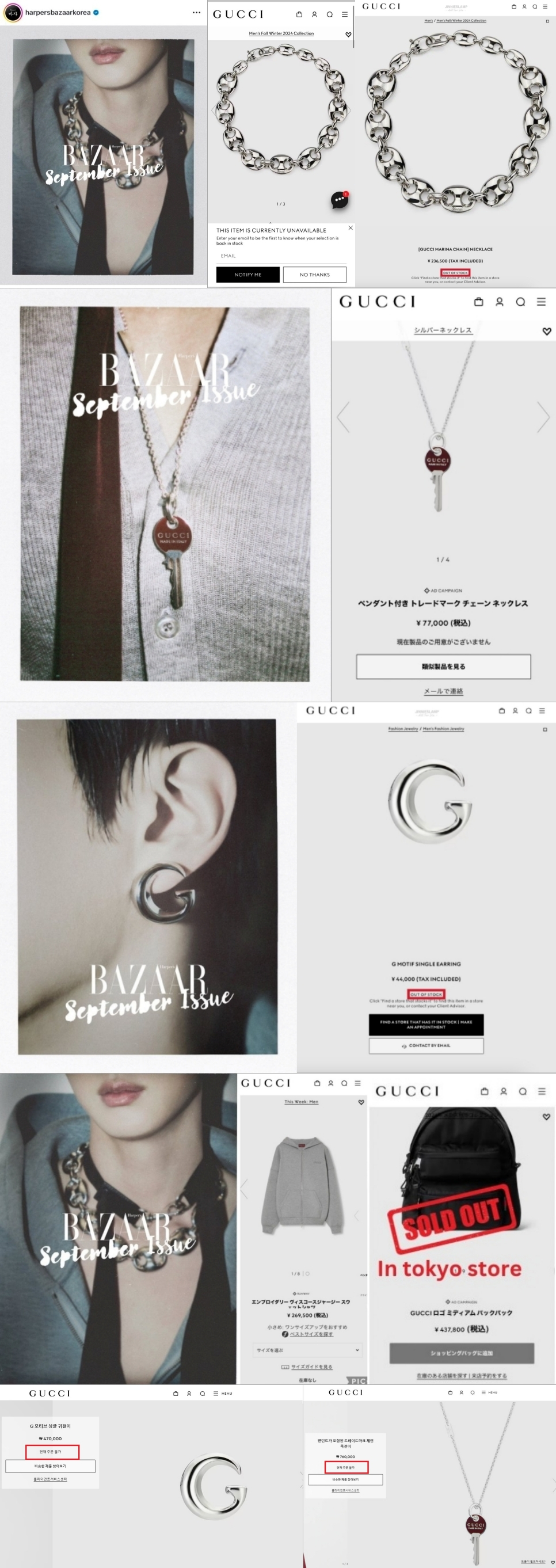 패션 잡지 하퍼스 바자(Harper's BAZAAR)가 구찌 제품을 착용한 '비주얼킹' 진의 화보를 공개하자마자 순식간에 미국에서 한화 216만 원 상당의 남성용 마리나 체인 목걸이가 초고속으로 품절됐으며 일본에서도 또한 동이 났다.