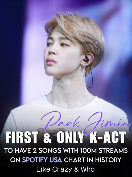 이로써 지민은 '후'와 지난해 발표한 솔로 1집 타이틀곡 'Like Crazy'(라이크 크레이지)가 미국 스포티파이 차트에서 1억 스트리밍을 돌파하며 지민은 차트 역사상 1억 이상 2곡을 보유한 최초이자 유일한 K팝 아티스트가 됐다.
