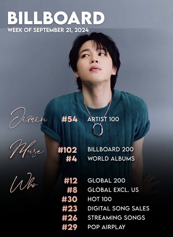 한편 지민의 '후'는 이러한 탄탄한 스트리밍을 바탕으로 미국 음악 전문 매체 빌보드의 최신 차트(9월 21일 자)에서 메인 송 차트 '핫 100' 30위로 8주 연속 차트인에 성공하며 K팝 최상단에 자리했다. 또한 '글로벌 200' 12위, '글로벌 (미국 제외)' 8위로 8주 연속 차트인을 이어가고 있다.
