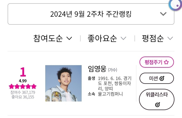 임영웅은 9월 2주차 아이돌차트 평점랭킹에서 36만 7179표를 얻어 1위를 차지했다.