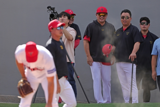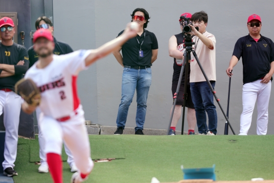 에릭 스타우트(왼쪽)의 투구를 손승락(오른쪽에서 세 번째) 수석코치와 이범호(오른쪽) KIA 감독이 지켜보고 있다. /사진=KIA 타이거즈 제공