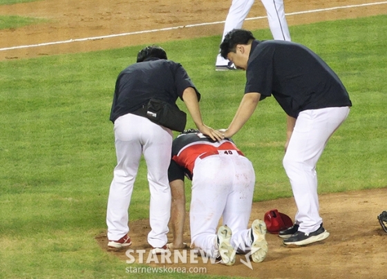 '2024 신한 SOL 뱅크 KBO리그' 두산-KIA전이 19일 서울 잠실야구장에서 열렸다. KIA 선발 스타우트가 2회말 두산 정수빈을 상대하다가 마운드에 쓰러져 고통을 호소하고 있다. /사진=김진경 대기자
