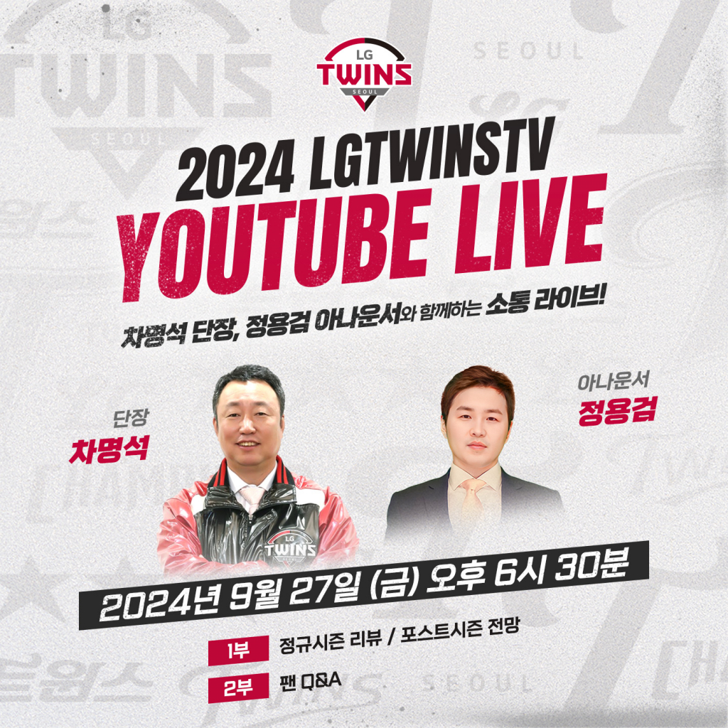 먼저 1부에서는 차명석 단장과 함께 2024 정규시즌 리뷰와 분석 및 포스트시즌을 전망하는 내용으로 진행한다. 2부에서는 온, 오프라인을 통해 팬 질문에 답하는 시간을 가질 예정이다.