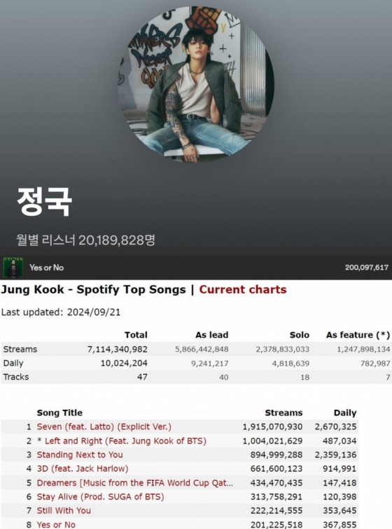 정국이 지난해 11월 발매한 첫 솔로 앨범 'GOLDEN'(골든) 수록곡 'Yes or No'(예스 오아 노)는 최근 스포티파이에서 2억 스트리밍(필터링 전)을 돌파했다.